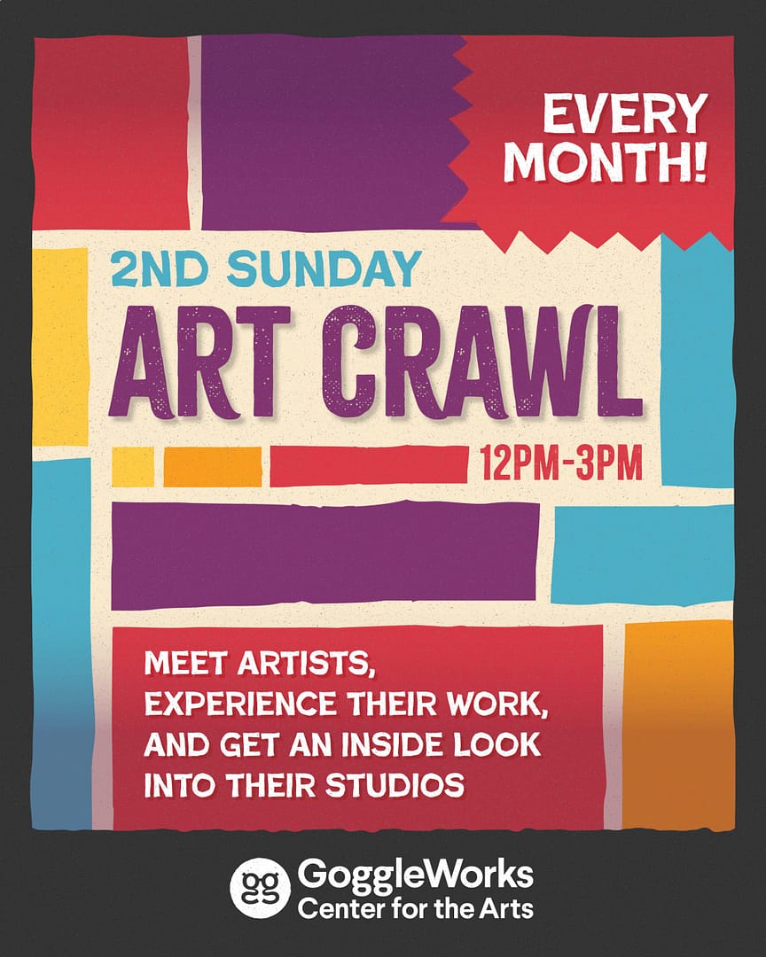 🖼️Support the art community in GoggleWorks at our in-house free studio crawl featuring the artists on the second and third floors. Explore the chance to meet artists, experience their work, and get an inside look into their studios. Connect with your community and explore the creativity that flows through GoggleWorks.