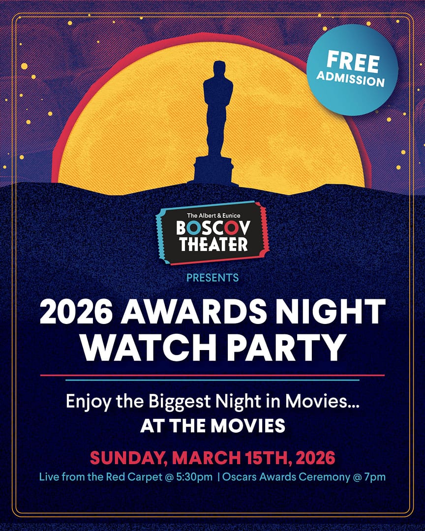 Join us for our third annual Awards Night Watch Party at The Boscov Theater! Kicking off at 5:30pm, our concession stand will be open and fully stocked as the live red carpet coverage is projected on the big screen. Starting at 7pm, the 98th Academy Awards (Oscars) ceremony begins – also projected on the big screen!