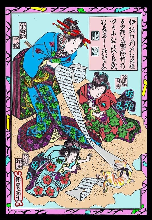 Alan Cernak works in a variety of media, including paper sculpture, acrylic paint, pencil, and digital illustration, and enjoys working with local schools and youth groups to create large-scale art projects. After traveling to southern Japan in 2013 as an artist in residence at Studio KURA, Alan began working on his current series of Shrine Pictures, in which he strives to digitally recreate ancient Japanese shrine and temple artwork that has been damaged by weather and the passage of time.
