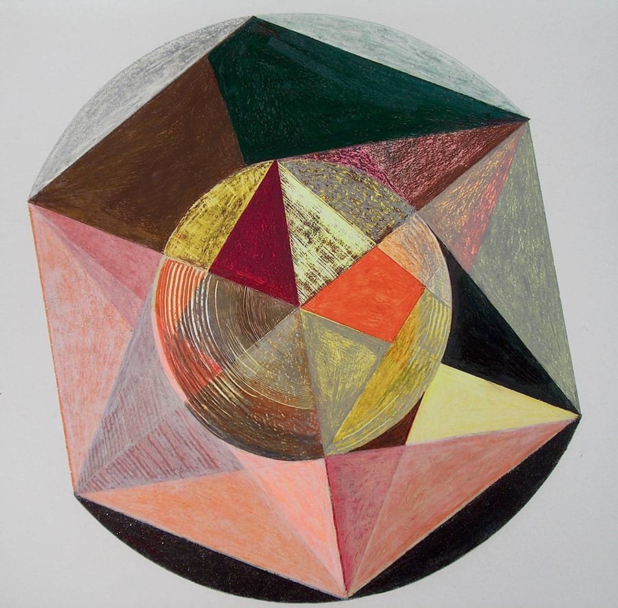 Throughout her thirty-nine year art career Rebecca Ross’ artworks have explored the themes of spirituality, symbolism, history, art history, music and peacefulness of water. For the past twenty-nine years much of her work has been created using an oil pastel, scratch board technique, which scrapes into the base coat of fluorescent and iridescent color. She is well known for her geometric abstractions of religious cultural symbols such as Pennsylvania-German barn stars. Modernistic interpretations of Renaissance paintings and Rembrandt drawings are another well known series. A new series done in colored pencil focuses on people performing music.