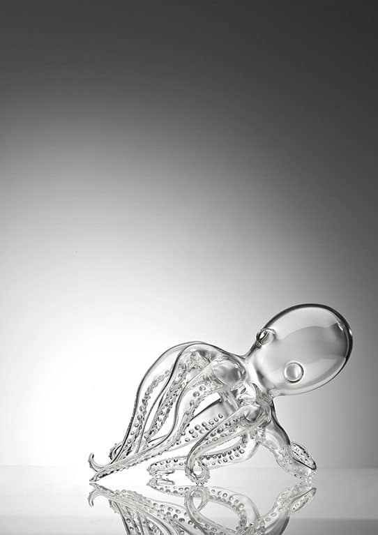 An introspective and self-taught artist, over the years he put together all the lessons learned and the experience gained, and finally broke away from the traditional glass of Murano. Inspired by the never-ending variety of the natural world, the shapes of animals and plants magically come to life, even in their tiniest details, in an celebration of lightness and transparency. Simone Crestani’s technique, together with his personal style and sophisticated poetics, allow him to create an interaction, where glass overcomes its purely material dimension and becomes a fine and studied artistic language, a pure, silent and crystalline conceptual element.